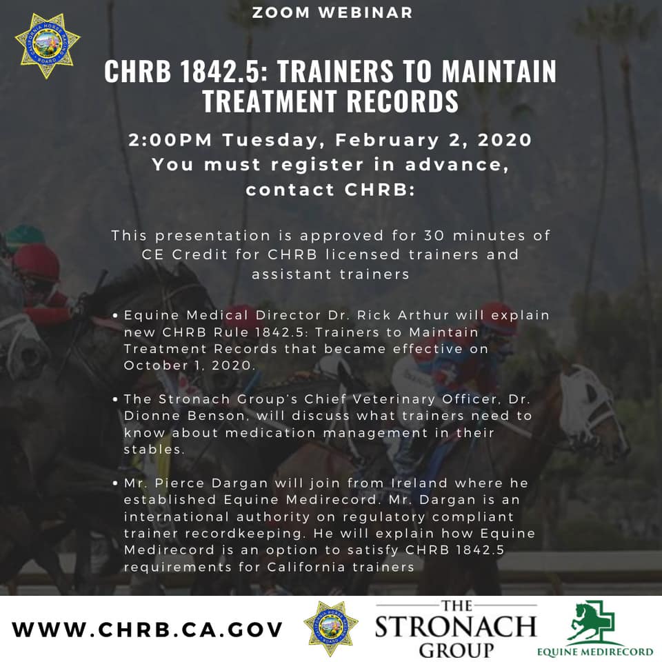 The California Horse Racing Board (CHRB) held its first webinar for their CE training requirements for CHRB licensed trainers with a look at the new CHRB 1842.5 rule, trainers required to maintain treatment records. The module was conducted by Dr Rick Arthur, CHRB Equine Medical Director, Dr Dionne Benson, Stronach Group’s Chief Veterinary Officer, and Pierce Dargan, CEO of Equine MediRecord. The presentation was approved for 30 minutes of CE credits for the trainers who would attend.