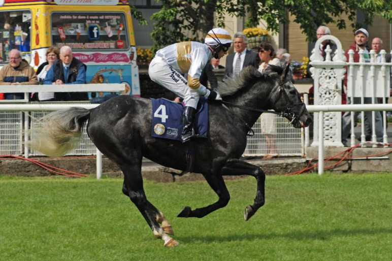 Lahoob (GB) and Mr Matt Stanley after winning the President of the UAE Cup (Listed PA) at the Curragh in 2014, trained by Beverley Deutrom for HE Sheikh Nasser Al Hashar