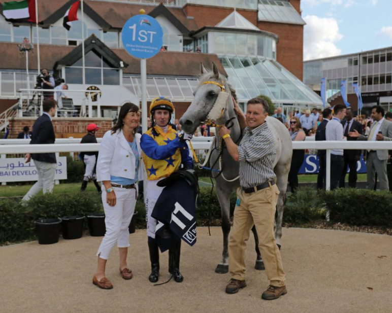 Jill Irwin with Poppstar (GB), Martin Dwyer and Anthony Holdsworth after winning the Emirates NBD Premier Handicap at DIAR Newbury in July 2019
